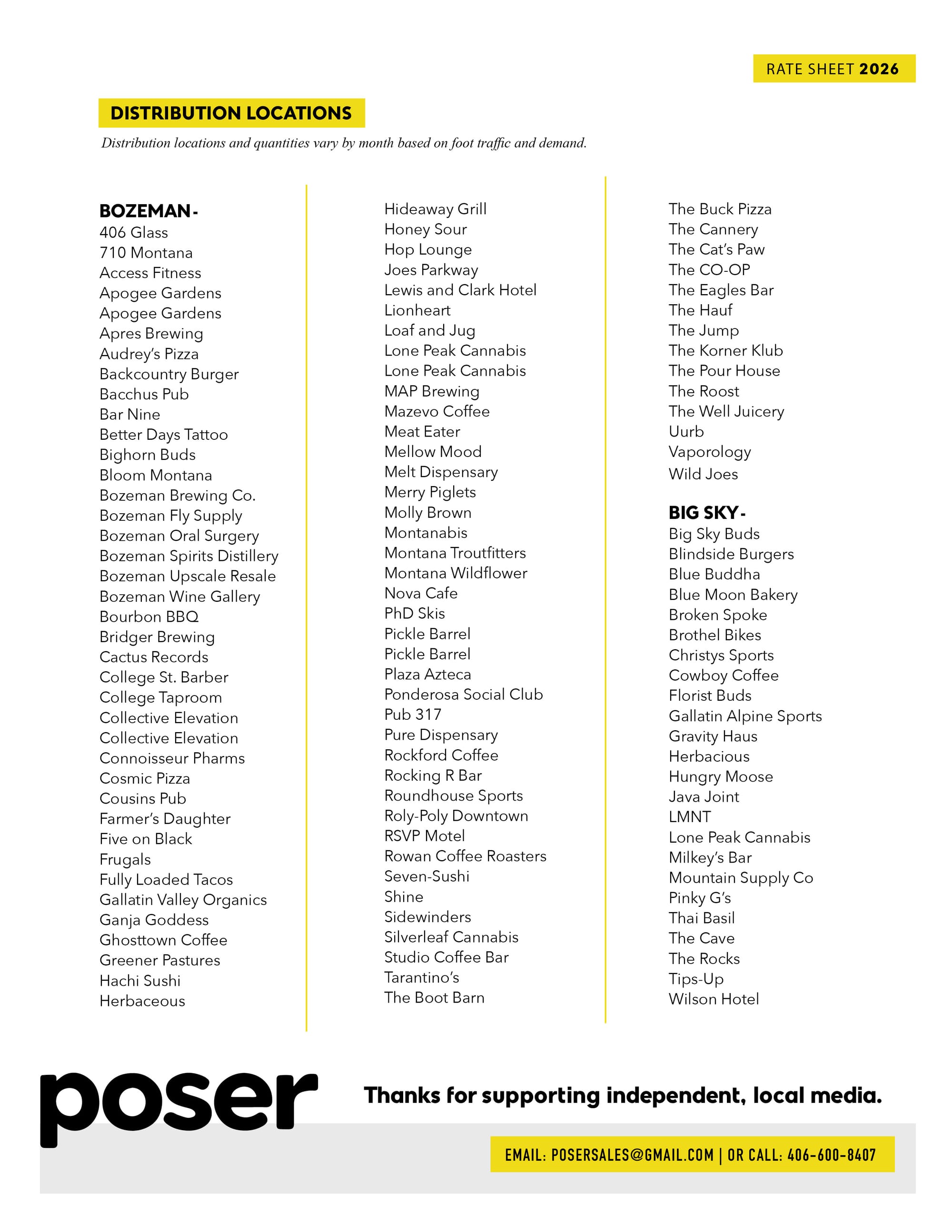 We print 5,000 copies monthly and drop them at over 90 high-traffic spots across Bozeman and Big Sky—breweries, bars, coffee shops, restaurants, campus hotspots, and more. As we expand across the Treasure State, we’re winning the hearts of posers and native Montanans alike.